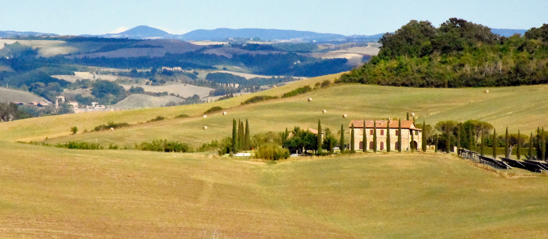 L’ampio spazio esterno attorno al casale comprende una piscina con una splendida vista sulle colline senesi.